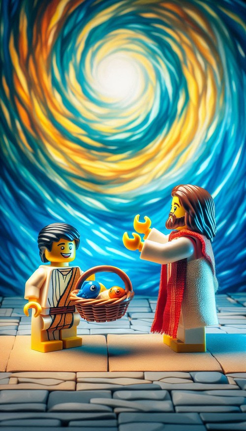 A boy in the crowd had five barley loaves and two small fish. Jesus took the loaves and fish, gave thanks, and then distributed the food through his disciples to the people. Miraculously, the food multiplied to feed about 5,000 men, plus women and children, and there were even twelve baskets of leftovers collected afterward.