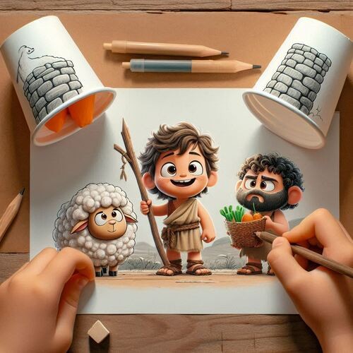 - Abel with a happy face, holding a sheep (his best offering to God).