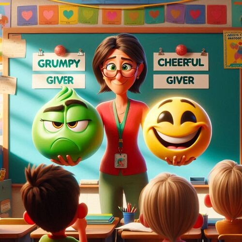 Use this as a simple visual activity to contrast grumpy giving with joyful giving and to anchor 2 Corinthians 9:7.
