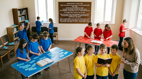 - Assign verses to each team. Print the verses on different colours paper and hide them.