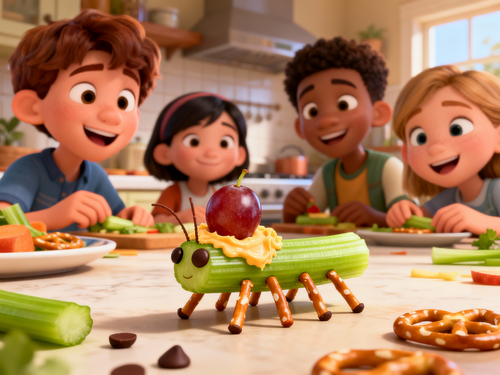 - Place a grape at one end of the celery for the grasshopper’s head (you can secure it with a bit of cheese).